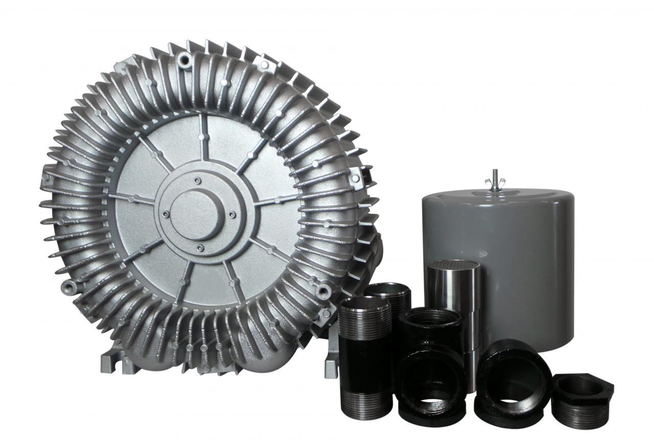 Atlantic Blowers' AB-1402 Three Phase/Double Stage Regenerative Blower can be used for various pressure or vacuum applications. The AB-1402 produces a maximum flow of 776 CFM. The maximum pressure and vacuum is 118 inH2O and 134 inH2O respectively.The AB-1402 has a power output of 25 HP (18.5 kW) with speeds of either 3000 or 3600 RPM (50/60 Hz dual frequency). The voltage is 220-275Δ/380-480Y with an FLA rating of 76.0Δ/44.0Y. Measuring at a distance of 3 ft. the blower will produce a noise level of 81 dbA. The inlet/outlet connection size is 2.50" female NPT.